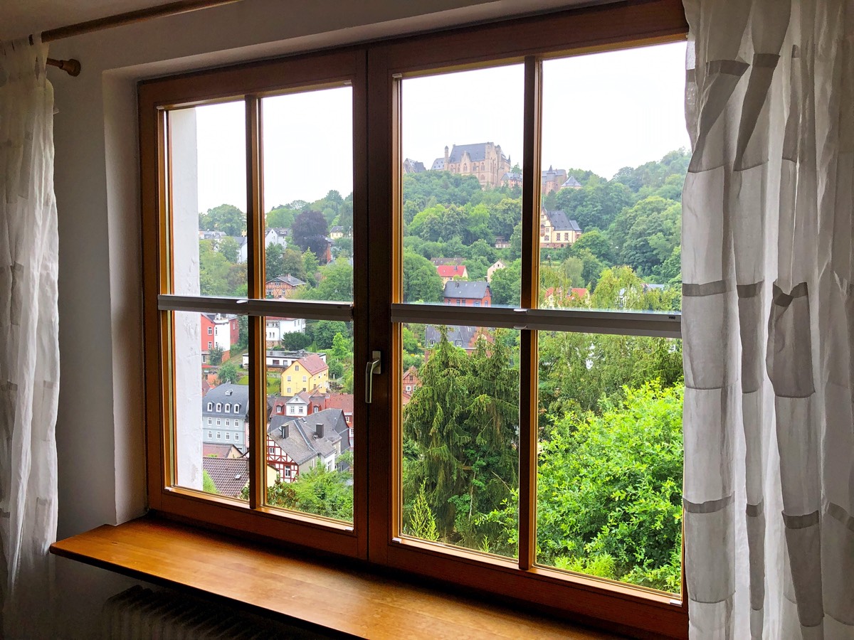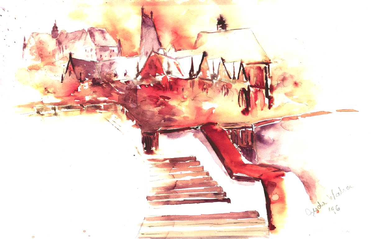 (Alte Marburger Universität mit Schloss im Hintergrund - gemalt anlässlich des Forums «Die Soziale Poesie therapeutischer Gespräche» (viisa) 1996).